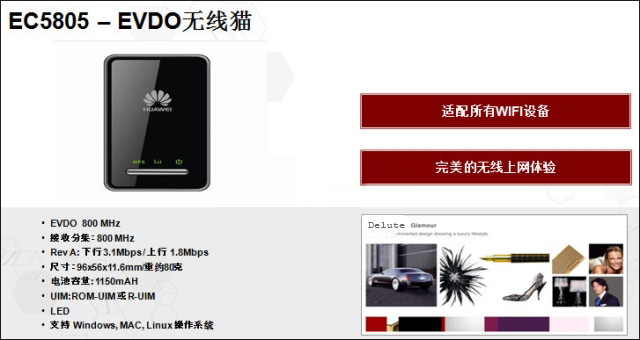 华为EC5805--EVDO无线猫,也称为电信版E5,作为华为E5830的加强升级版,是集无线路由器和无线上网卡于一体,真正实现移动无线上网,多人共享。