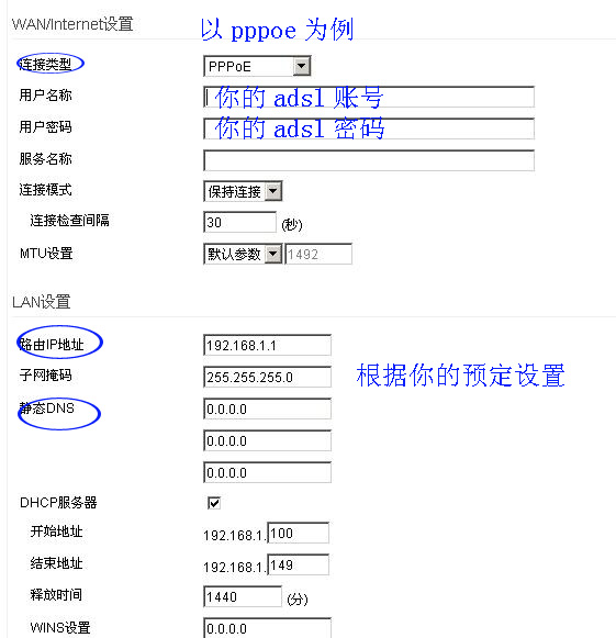 在这里,我们多说一句:有客户说路由器上网了可是电脑打不开网页,这是因为你没设置你的dns,使你的域名没有得到正确的ip指向。。。。。。。。填入你网络对应的dns就可以了,路由器或者无线网卡任何一端填入就够了