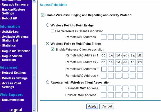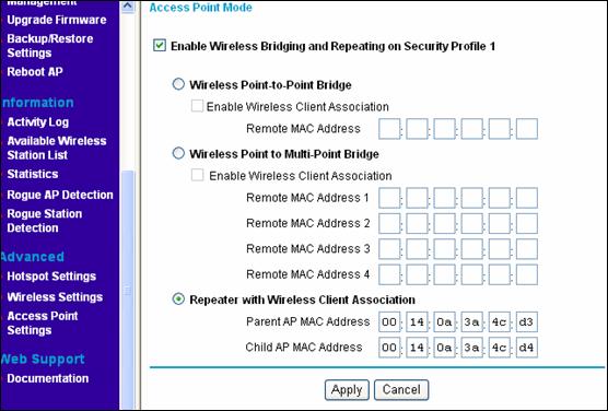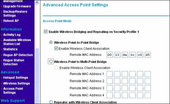 - Enable Wireless Client Association 可选可不选,如果选了,则表示该AP在工作在桥接的同时还可以接入无线网卡,如果不选,则无线桥接过程中无线网卡不可以接入。