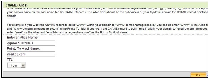 然后,在图示的页面中,增加一个CNAME别名。具体信息如下: