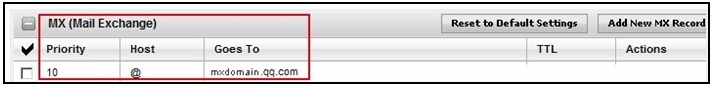 MX记录用来指定由我们来对您的域名提供邮件服务。MX的设置入口跟CNAME在相同页面,请参考上文找到MX设置页面。然后将您的MX记录设置为mxdomain.qq.com ,优先级为10