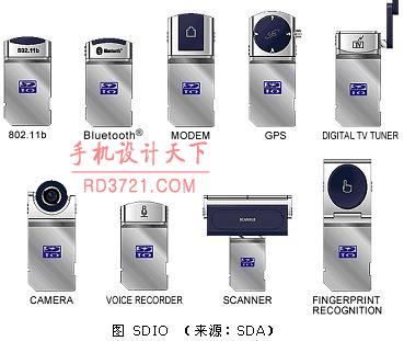 目前市场上有多种SDIO接口的外设,比如SDIO蓝牙,SDIO GPS,SDIO无线网卡,SDIO移动电视卡等。这些卡底部带有和SD卡外形一致的插头,可直接插入SDIO卡槽(即为SD卡槽)的智能手机、PDA中,即可为这些手机、PDA带来丰富的扩展功能。用户可根据实际需要,灵活选择外设扩展的种类、品牌和性能等级。SDIO已为成为数码产品外设功能扩展的标准接口。