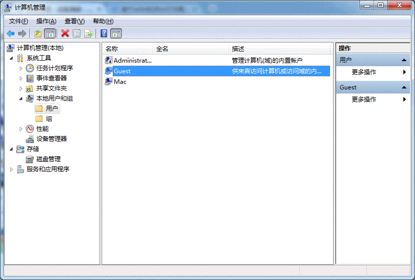 2. 在弹出的【计算机管理】窗口中找到【Guest】用户,如下图所示: