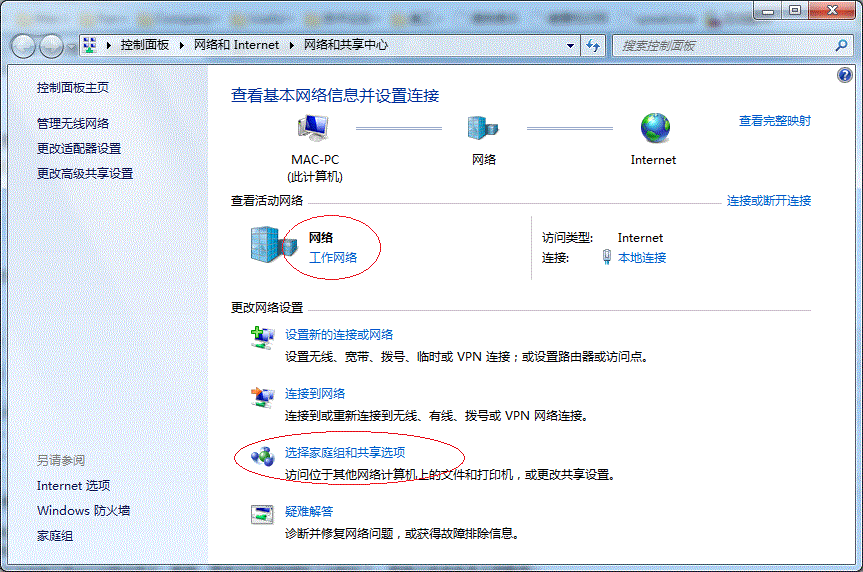 2. 记住所处的网络类型(笔者的是工作网络),接着在弹出中窗口中单击【选择家庭组和共享选项】,如下图: