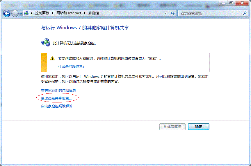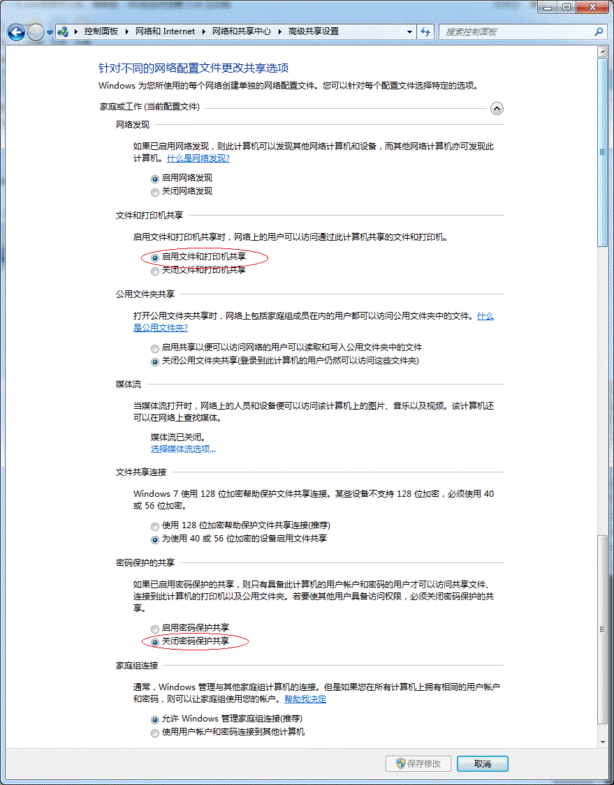 4. 如果是家庭或工作网络,【更改高级共享设置】的具体设置可参考下图,其中的关键选项已经用红圈标示,设置完成后不要忘记保存修改。