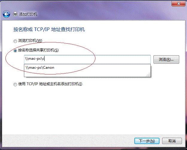 注意:如果此步操作中系统没有自动给出提示,那么很可能直接点击【下一步】会无法找到目标打印机,此时我们可以把“计算机名”用“IP”来替换,如下: