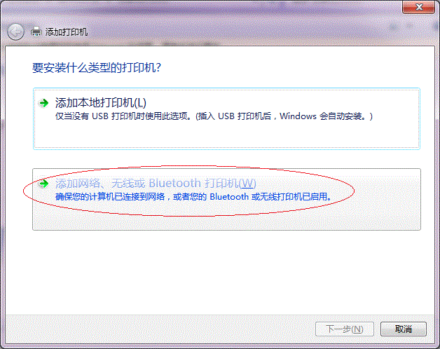 接下来,选择【添加网络、无线或Bluetooth打印机】,点击【下一步】,如下图: