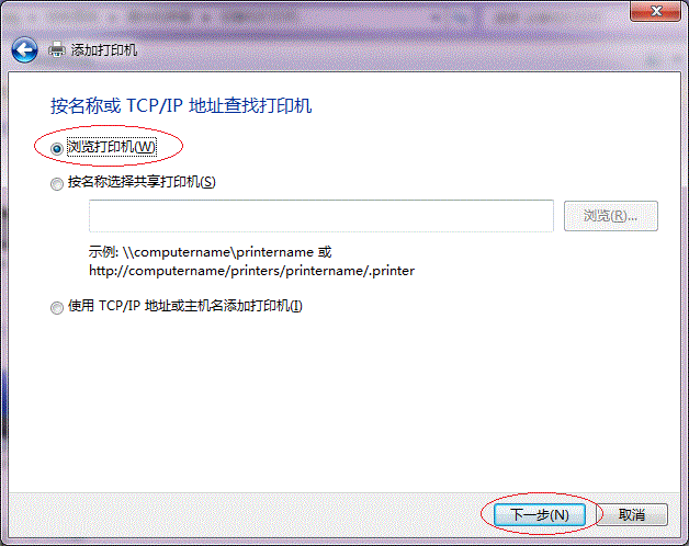 1. 选择【浏览打印机】,点击【下一步】,如下图: