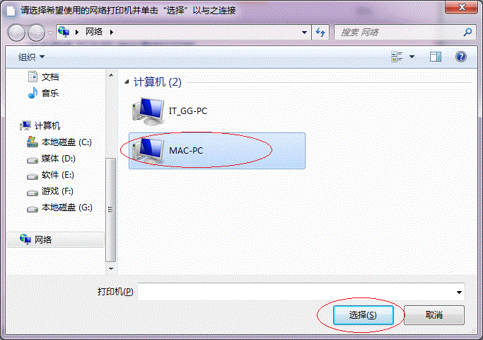 3. 选择目标打印机(打印机名就是在第二种中设置的名称),点击【选择】,如下图: