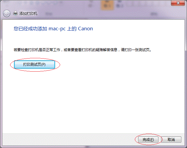 4. 至此,打印机已添加完毕,如有需要用户可点击【打印测试页】,测试一下打机是否能正常工作,也可以直接点击【完成】退出此窗口,如下图: