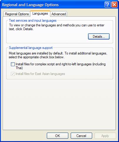 打开控制面板,点击“Data, Time, Language , and Regional Options”,然后再点击“Regional and Language Options”,会弹出一个窗口,打开这个窗口的“Languages”选项卡,选中“Install files for East Asian languages(安装东亚语言支持)”(图一),然后点击“Apply”。这时系统可能会要求你插入操作系统的安装光盘并复制一些文件,完成后会重启动。启动好,所有的中文文件和中文网页就都可以正常打开和使用了。