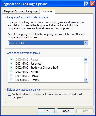 同样是在控制面板的“Regional and Language Options”设置下,打开“Advanced”选项卡,在这里有一个“Select a language to match the language version of the non-Unicode programs you want to use”的设置(图二),这里就是给你的非Unicode程序设置语言环境的。如果你比较常用简体中文的非Unicode程序,就在这里的下拉菜单中选择“Chinese(PRC)”,然后确定并重启动电脑。这样就可以正常使用这些程序了。