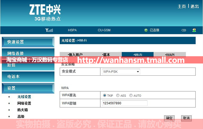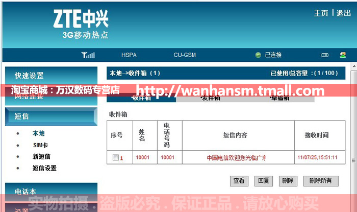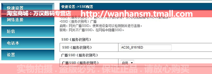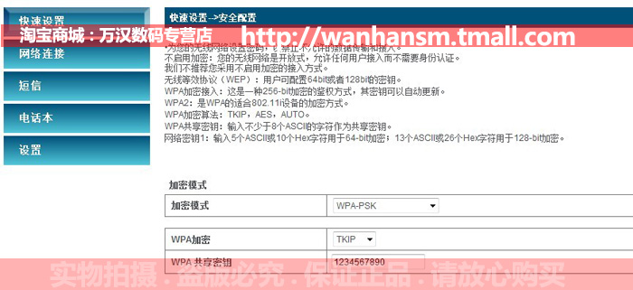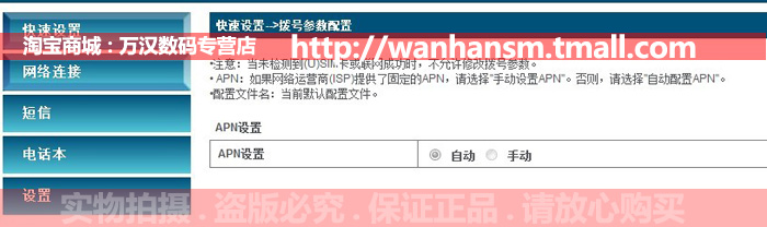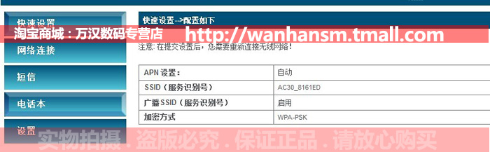 1,插上SIM卡(UIM卡)装上电池,拿出配的数据线,连接电脑,启动路由器,会提示安装驱动,默认安装完驱动之后桌面上会有一个客户端,可以不理会,然后打开IE或者别的浏览器,输入http://192.168.0.1或者http://ufi.home登陆到以下界面,输入管理员默认密码:admin 然后点击登陆进入管理界面 进入主页以后,选择快速设置,默认按下一步完成,可以设置登陆密码。 下一步 下一步 下一步 确认,就可以设置好密码。 附带的短信功能,可编辑发送接受短信息 在设置里面,无线设置,可设置新密码。