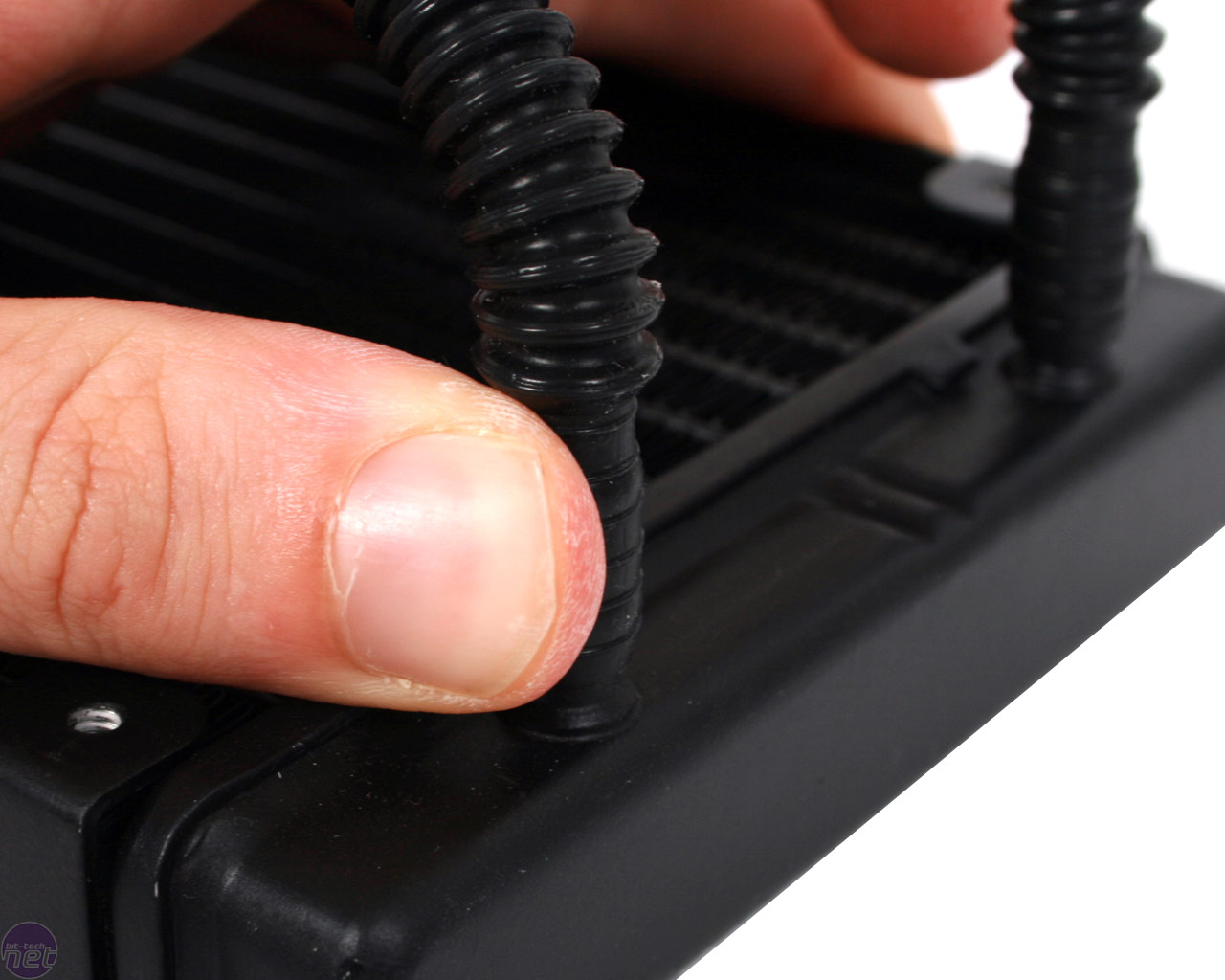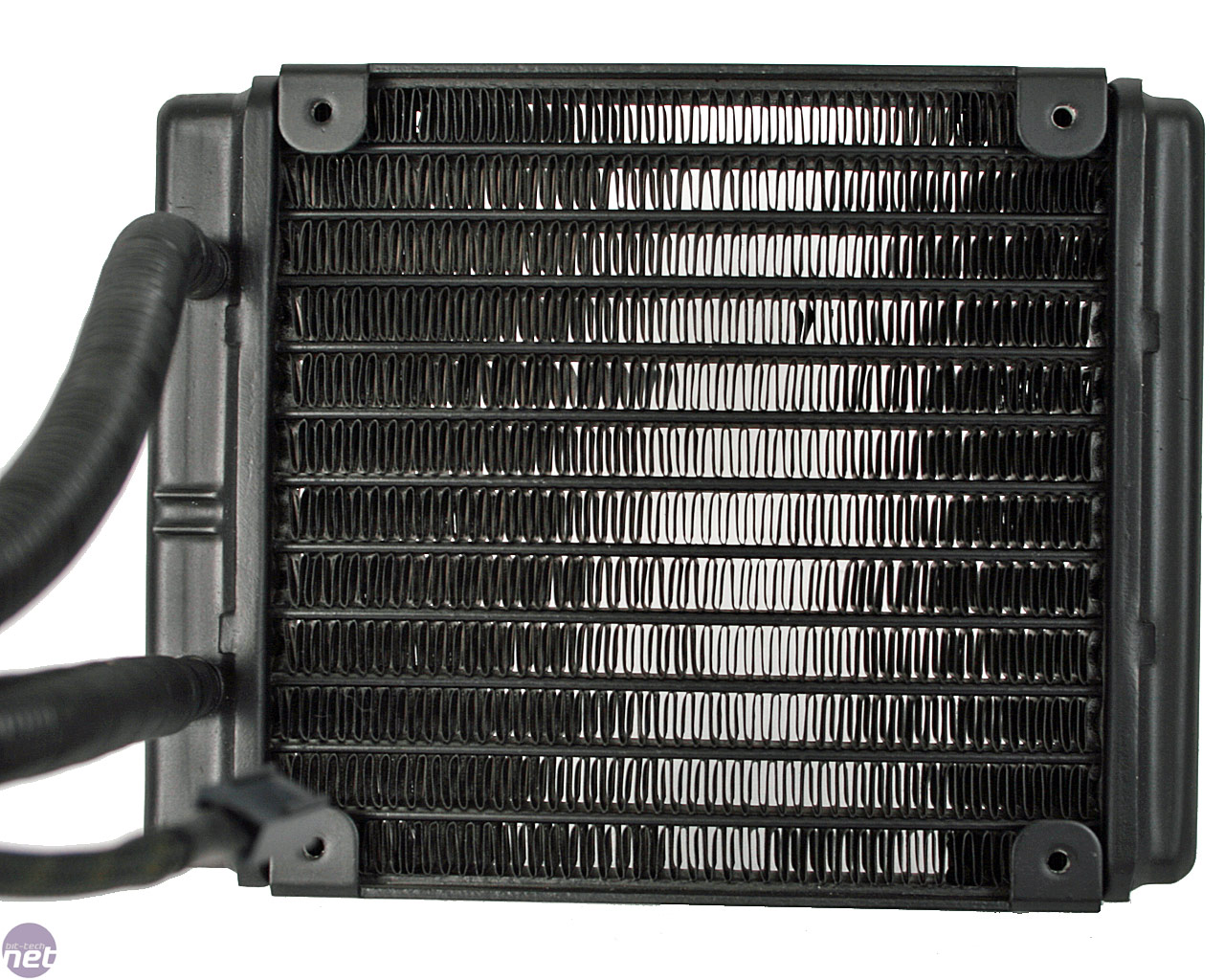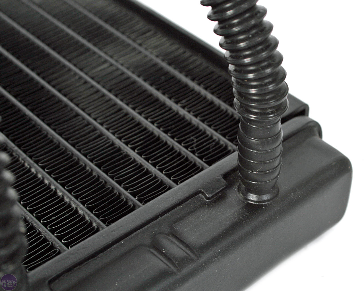 水冷头和散热排之间的水管足有30cm长,所以你可以把散热排安装在机箱内任何地方:顶部、后部、侧部或者任何你觉得不错的地方。这个25mm厚的散热排仅仅比一个120mm的风扇大一点,所以基本适合于所有的机箱。
