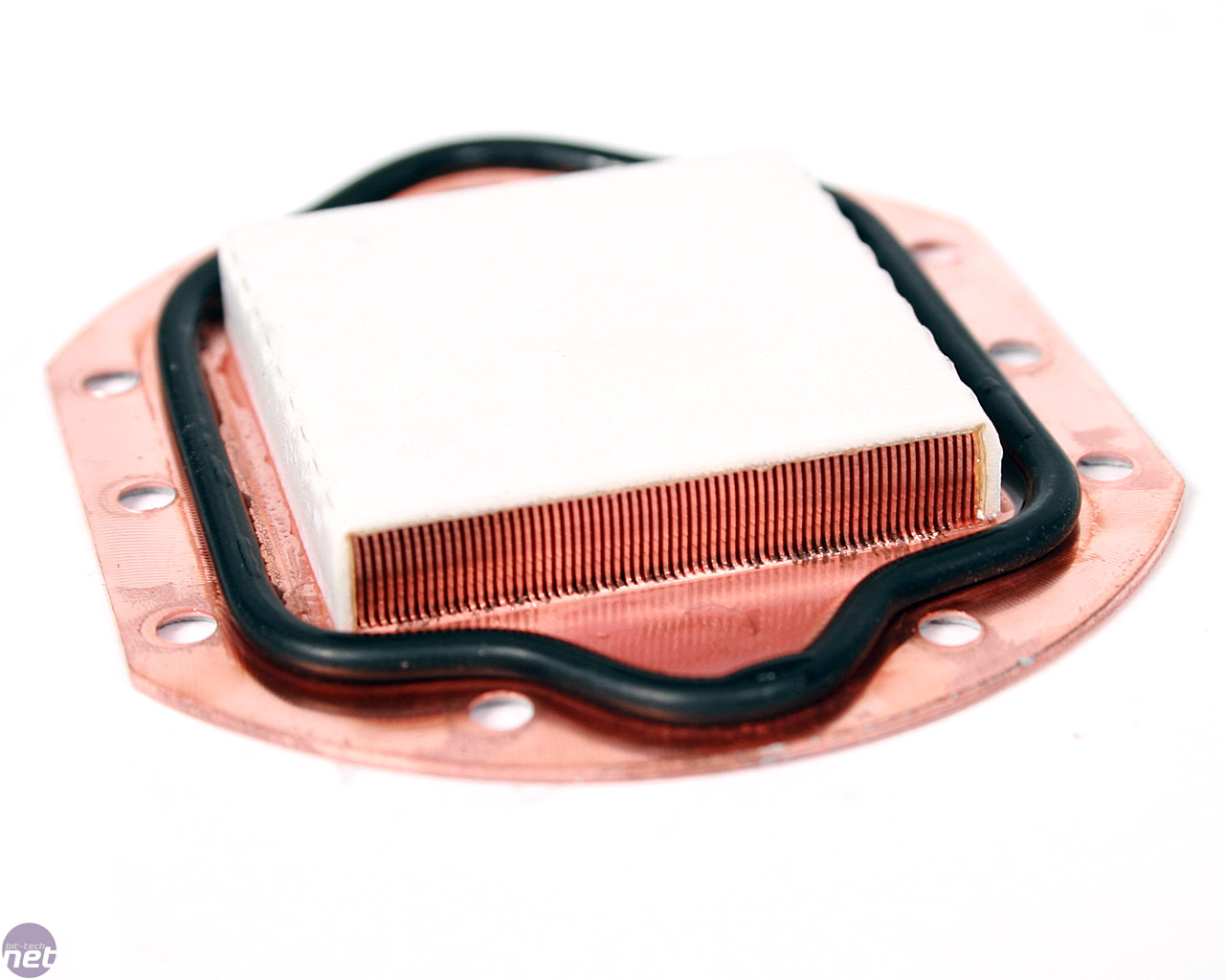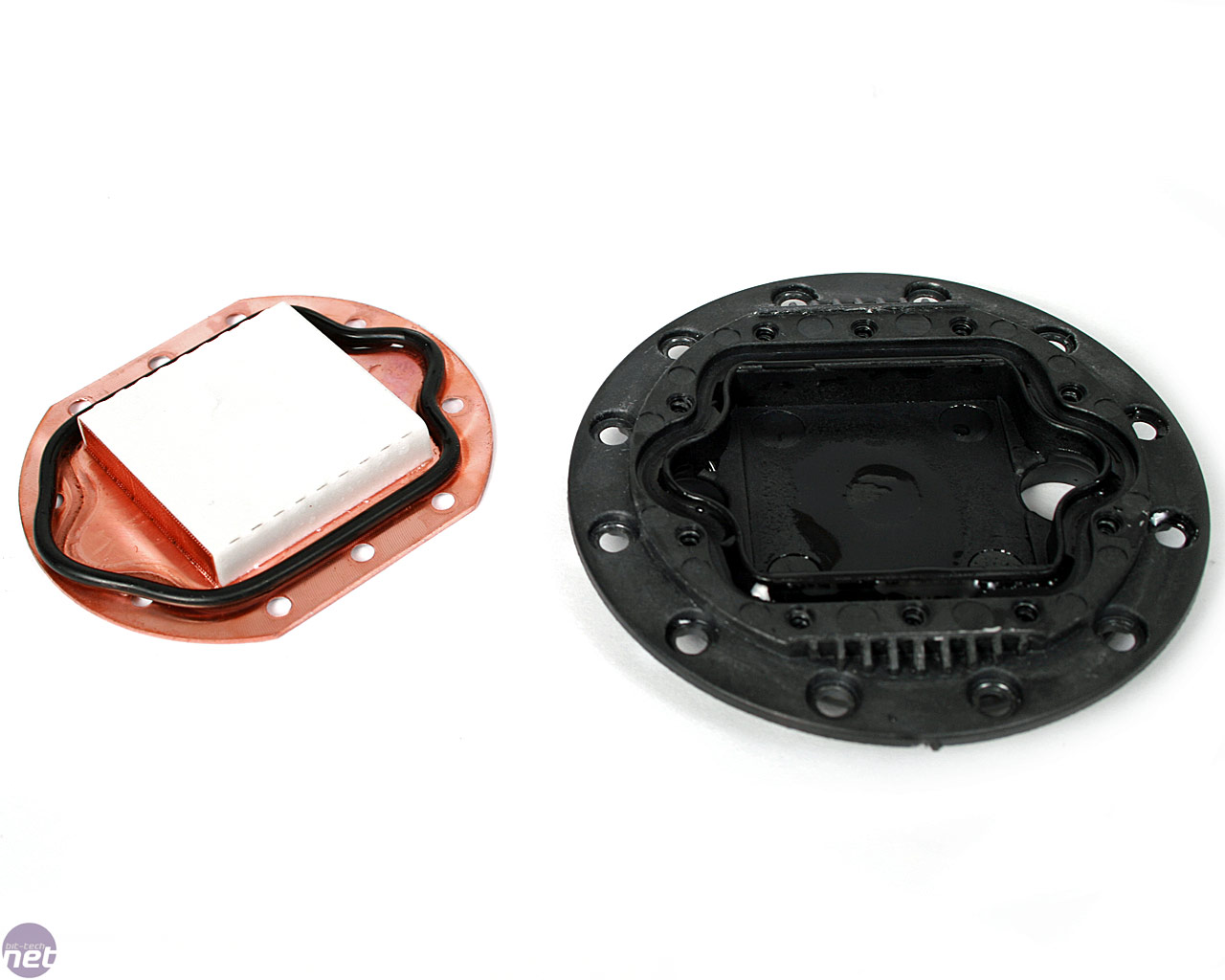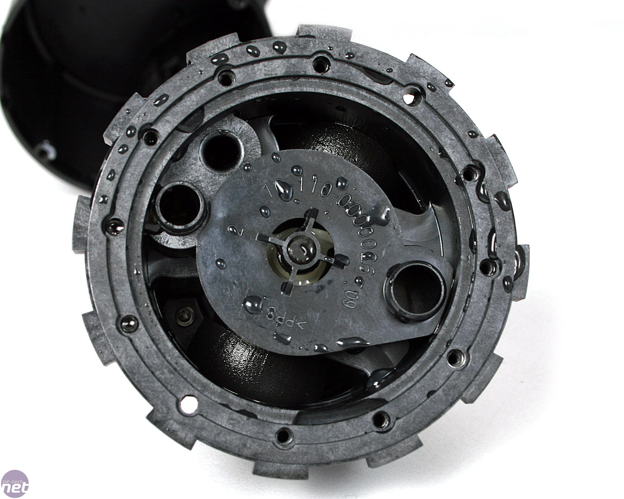 拆掉水冷头周围的螺丝,就可以看到水冷头的内部构造了——为了保持密封性,周围的螺丝很多。水泵的位置在水冷头的正中心,在微水道的正上方。这个微水道非常密集,我们甚至担心水冷头中小小的水泵产生的水压在微水道的水阻作用下会使得水流非常的缓慢。