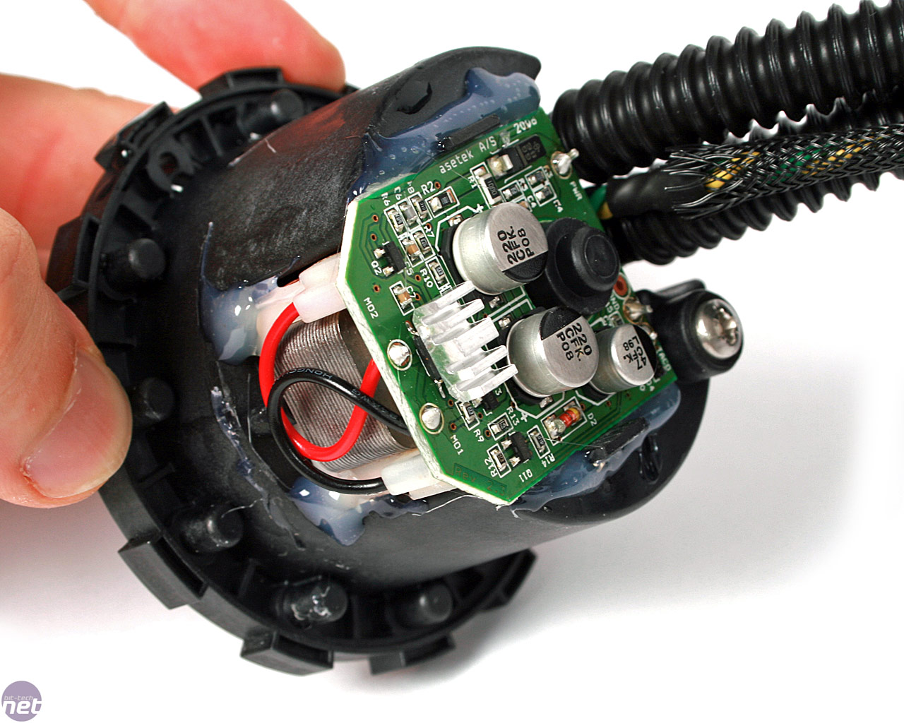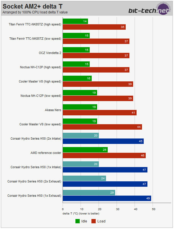 在AM2+平台上的测试有了完全不同的结果,我们一再测试,并且拆装了好几次,并多次改变水泵和风扇的3-pin电源接头,但是结果基本一致。原因在于CM的这款机箱缺少进气风扇,仅在机箱顶部有个120mm的风扇,以及I/O后面板处一个120mm风扇。我们改变海盗船H50的进气方式(进气或排气),但是都没有任何改善,并且整个套件都变得非常热。