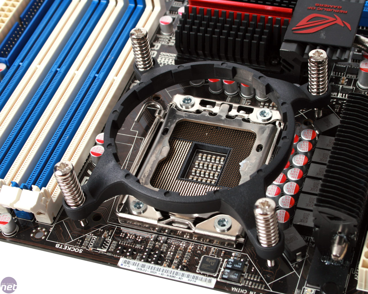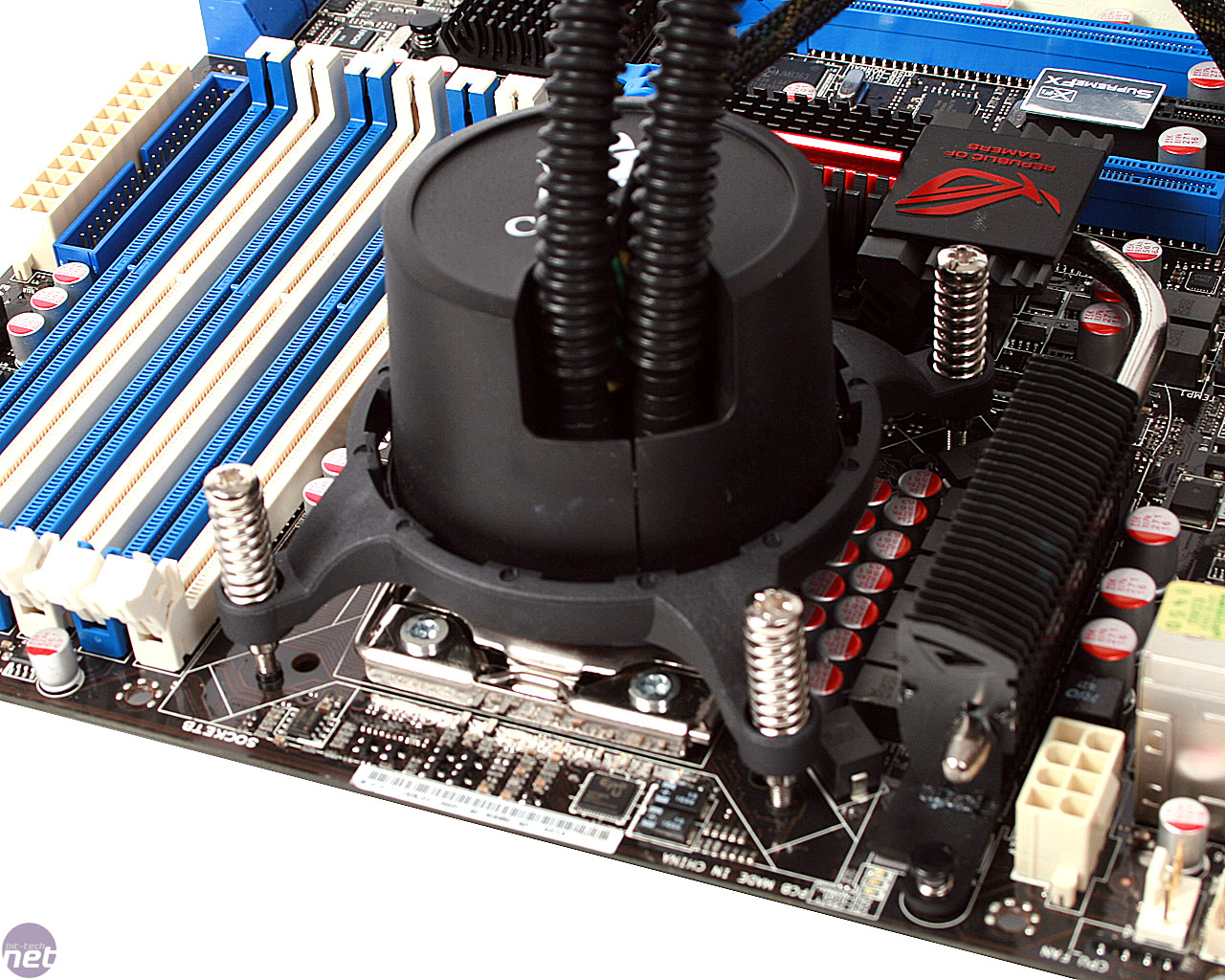 然后,将CPU水冷头对正扣具安放进去。在CPU水冷头的周围和扣具的内部都有塑料的互相咬合的塑料突起,放置很容易,放置到位后,稍微一转,即可将CPU水冷头预安装到位。再将扣具四周的四个弹簧螺钉拧紧,水冷头就安装好了。
